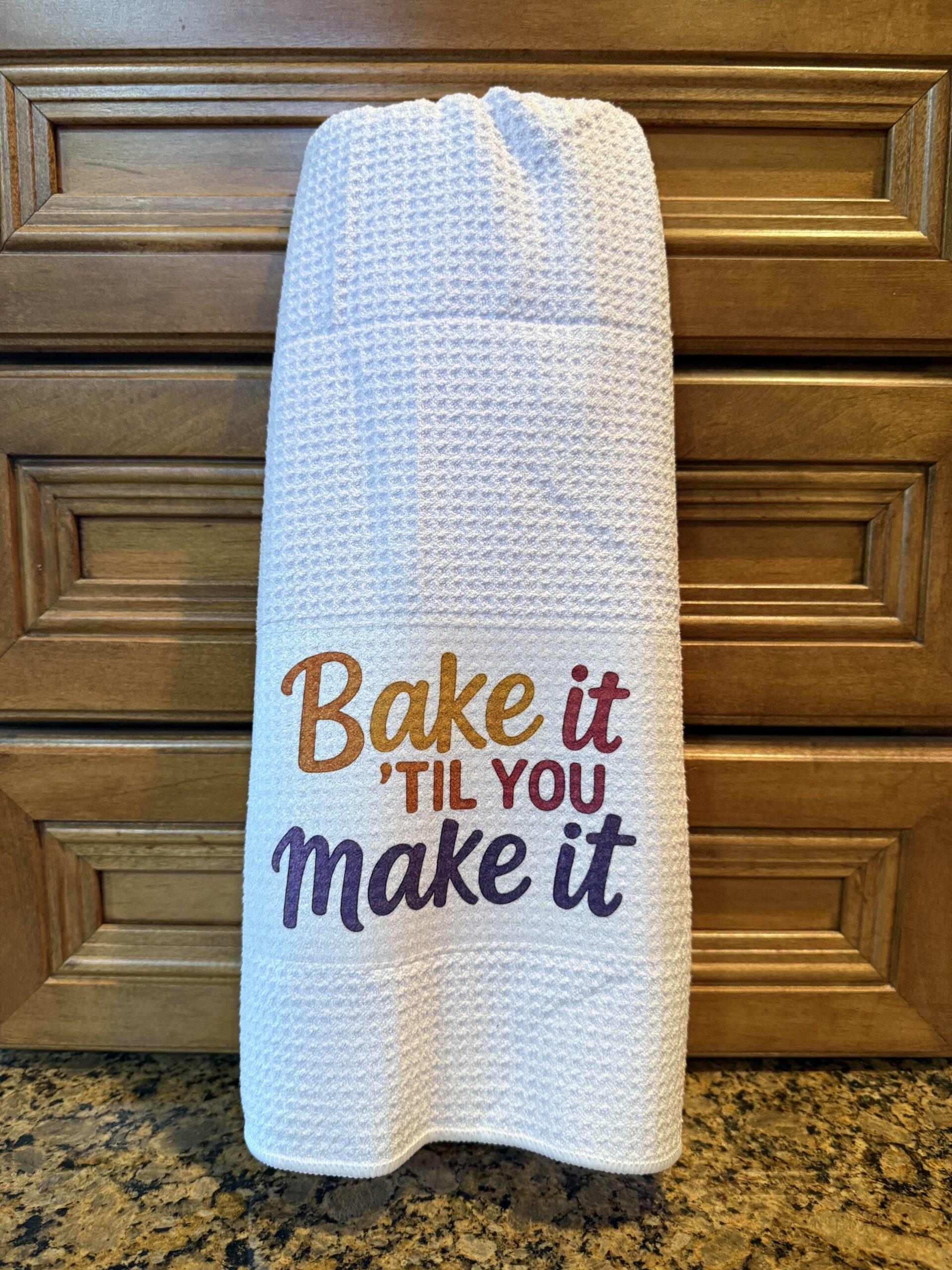 Add a playful and charming touch to your kitchen with our Bake It Till You Make It Kitchen Towel. Crafted using high-quality sublimation, each towel features bold, crisp lettering and vibrant details, making it both functional and decorative. Measuring approximately 22.5 x 16 inches, this towel is the perfect size for everyday kitchen tasks or as a stylish display piece. Due to our hand-pressing process, no two towels are exactly alike—each one is a unique work of art. Whether given as a thoughtful gift or kept for your own home, this towel adds personality, warmth, and charm to any space.