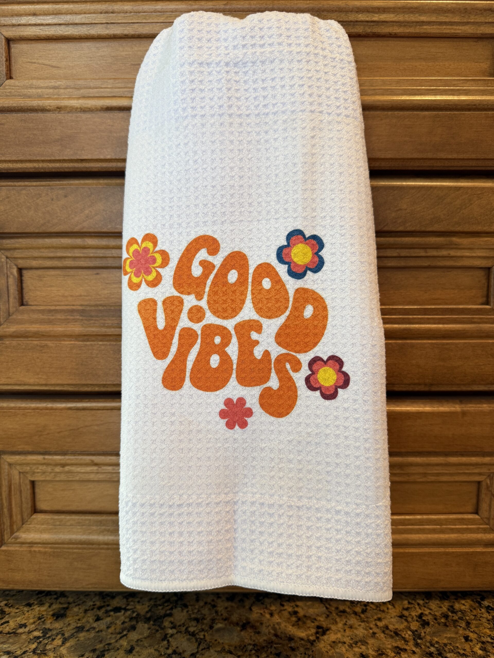Add a cheerful energy to your space with our Good Vibes Kitchen Towel. Featuring a bright, uplifting design and crafted using high-quality sublimation, this towel offers vibrant color and crisp detail that lasts through everyday use. Measuring approximately 22.5 x 16 inches, it’s perfect for drying dishes, decorating your kitchen, or simply spreading positivity. Because each towel is hand-pressed, no two are exactly alike—each one is a unique expression of joy. Whether given as a fun gift or kept as a reminder to stay upbeat, this towel brings warmth and good vibes to any kitchen.
