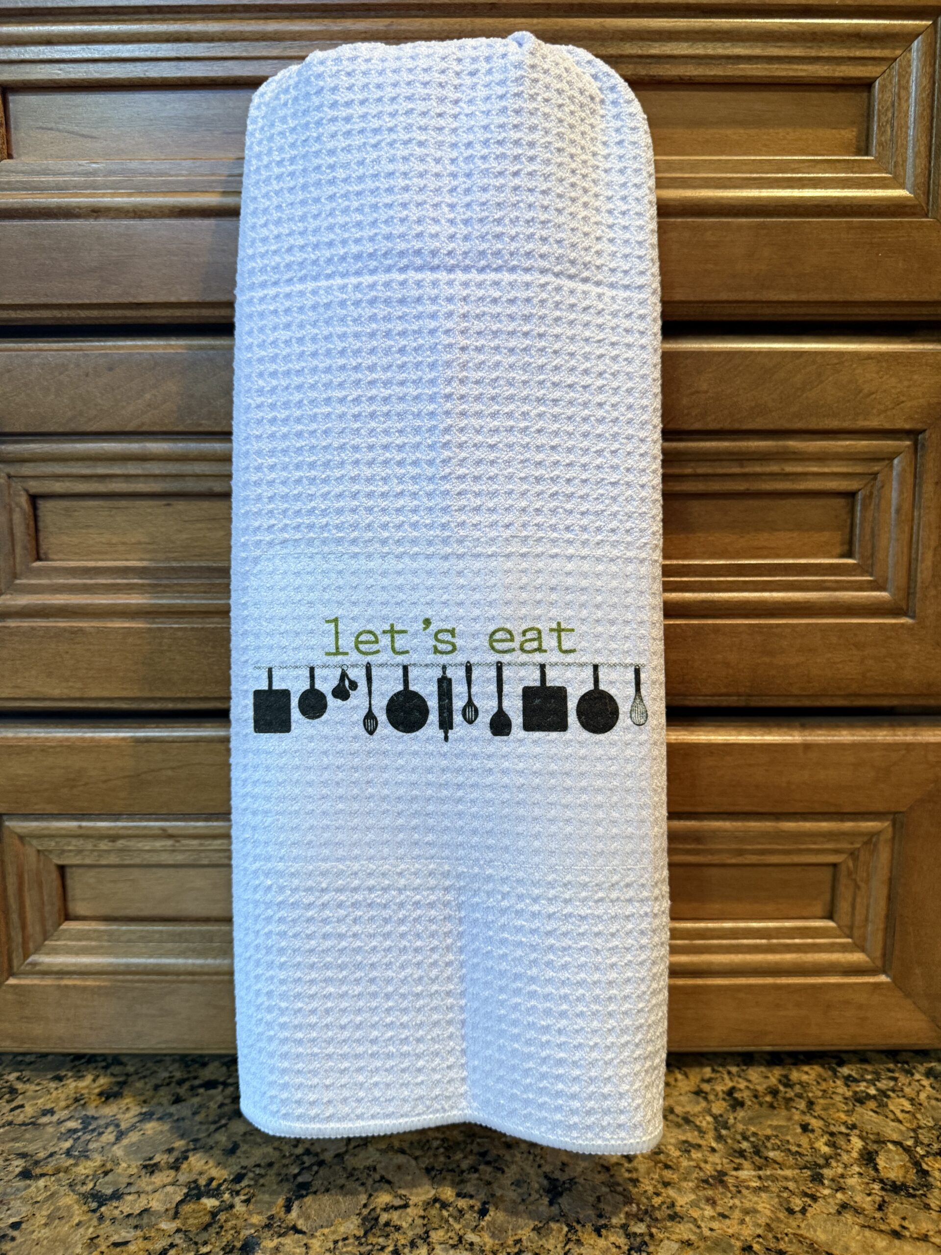 Add a fun and inviting touch to your kitchen with our Let’s Eat Kitchen Towel. Crafted using high-quality sublimation, each towel features bold, crisp lettering and vibrant details, making it both practical and decorative. Measuring approximately 22.5 x 16 inches, this towel is the perfect size for daily kitchen tasks or as a welcoming display piece. Due to our hand-pressing process, no two towels are exactly alike—each one is a unique work of art. Whether given as a thoughtful gift or kept for your own home, this towel brings personality, warmth, and charm to any space.