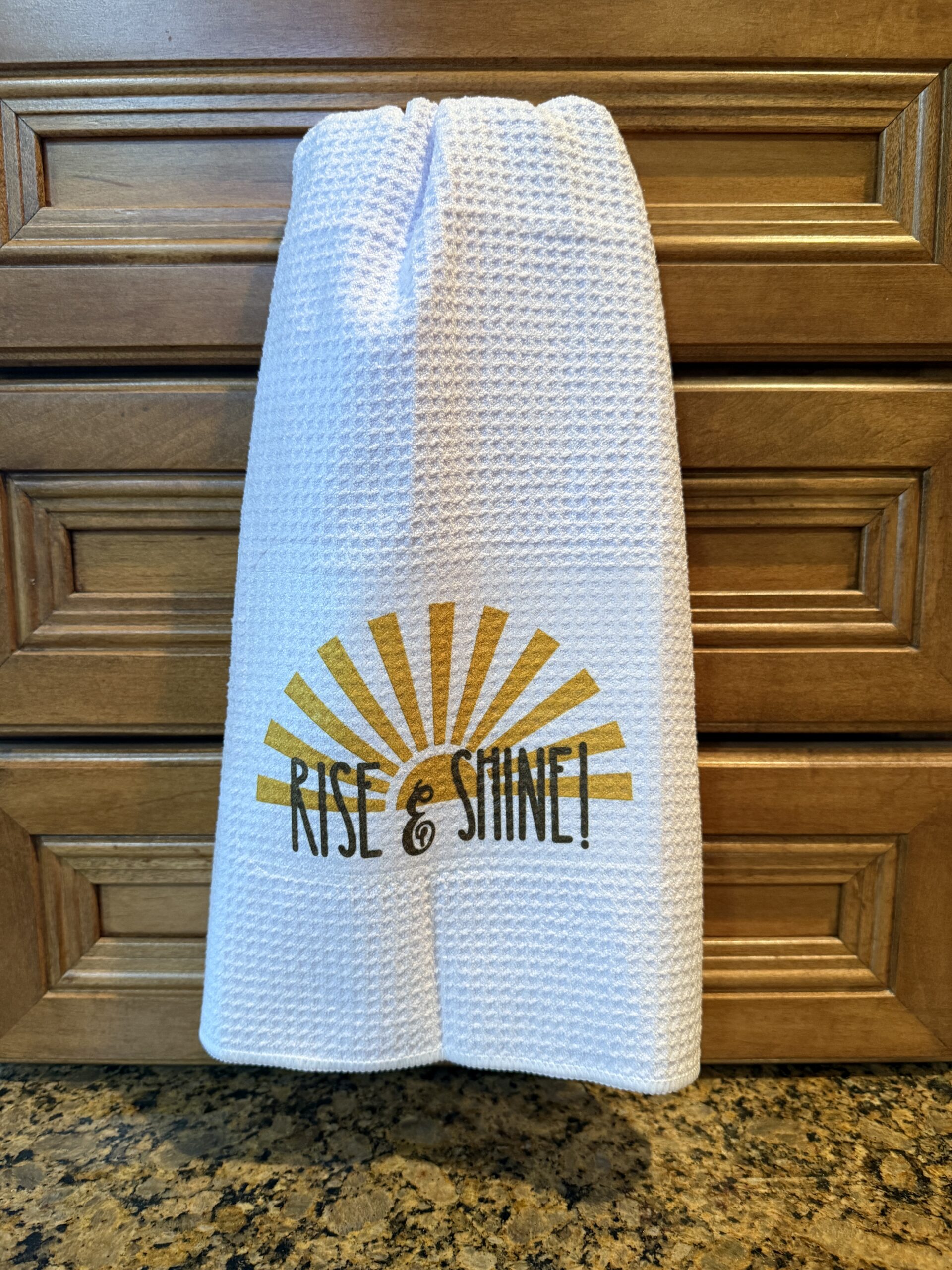Add an energizing and uplifting touch to your kitchen with our Rise and Shine Kitchen Towel. Crafted using high-quality sublimation, each towel features bold, crisp lettering and vibrant details, making it both practical and decorative. Measuring approximately 22.5 x 16 inches, this towel is the perfect size for everyday kitchen tasks or as a bright accent piece. Due to our hand-pressing process, no two towels are exactly alike—each one is a unique work of art. Whether given as a thoughtful gift or kept for your own home, this towel brings positivity and warmth to any space.