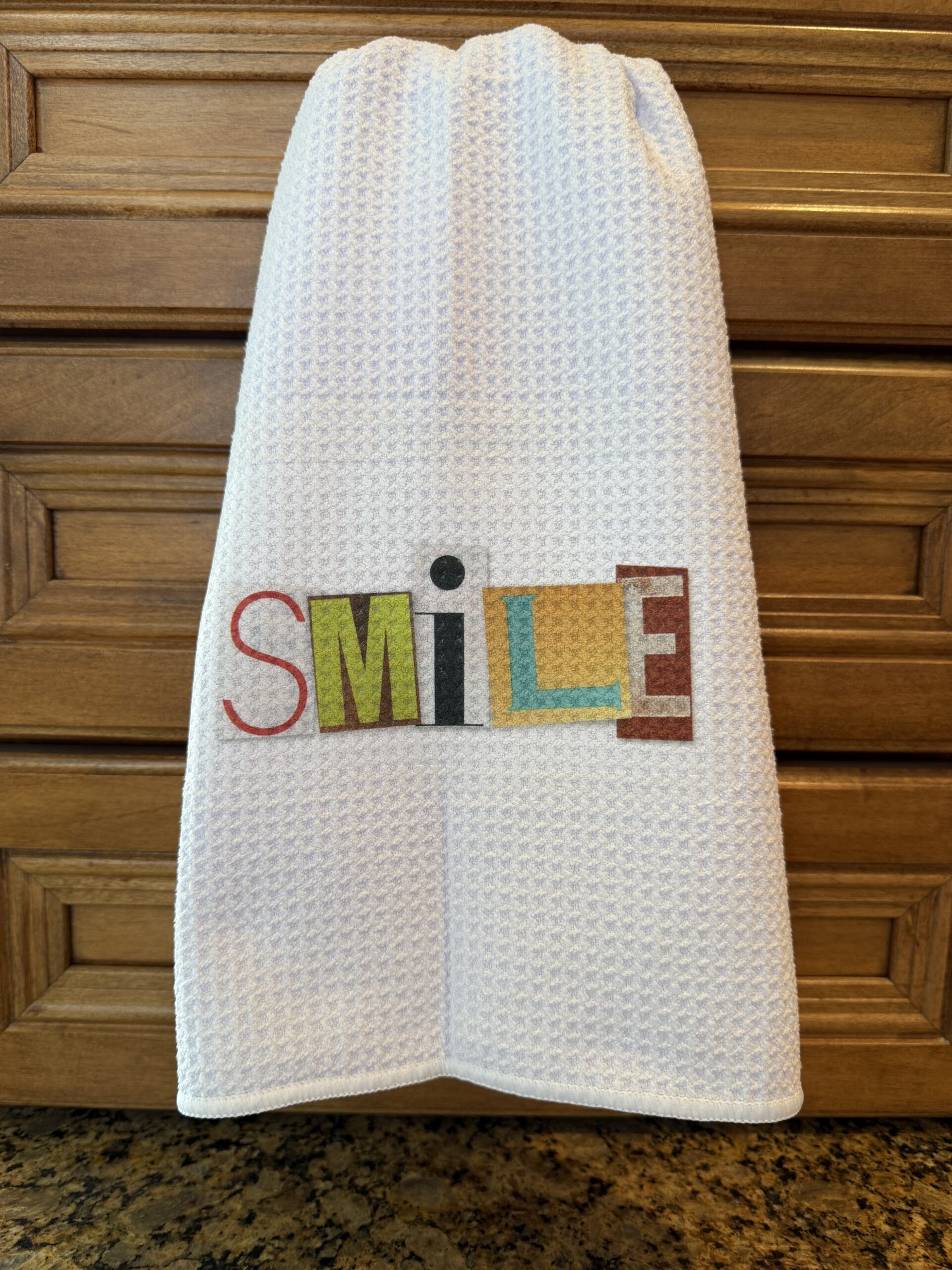Brighten your kitchen—and your day—with our cheerful Smile Kitchen Towel. Featuring a simple, joyful message and crafted using high-quality sublimation, this towel offers vibrant color and crisp, lasting detail. Measuring approximately 22.5 x 16 inches, it’s perfect for everyday use or as a sunny decorative accent. Due to our hand-pressing process, no two towels are exactly alike—each one is a unique little reminder to find happiness in the everyday. Whether it’s a thoughtful gift or a happy addition to your own kitchen, this towel brings warmth, charm, and a reason to smile.